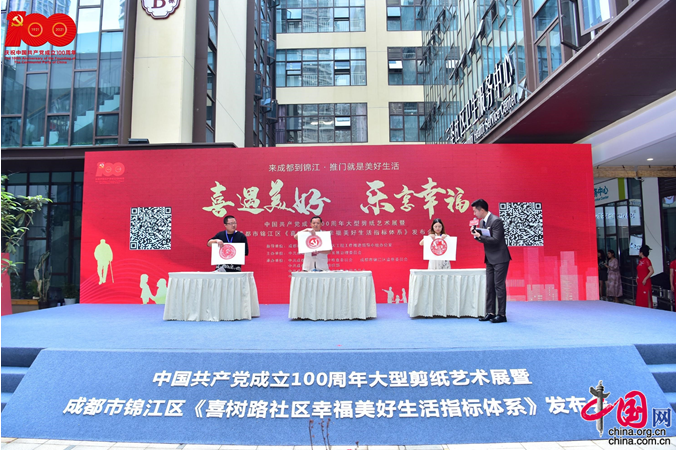 中国网5月31日讯(王李科 )大力弘扬中华优秀传统文化,丰富社区居民精神文化生活,为建党100周年献礼。成都市锦江区建党100周年大型剪纸艺术展览暨2021年桉树林文创生活集市节于5月28日在锦江区三圣街道喜树路社区“喜乐荟”广场拉开序幕。本次活动由成都市委城乡社区发展治理委员会主办,锦江区纪委监委、区委组织部、区委社治委、三圣街道共同承办。