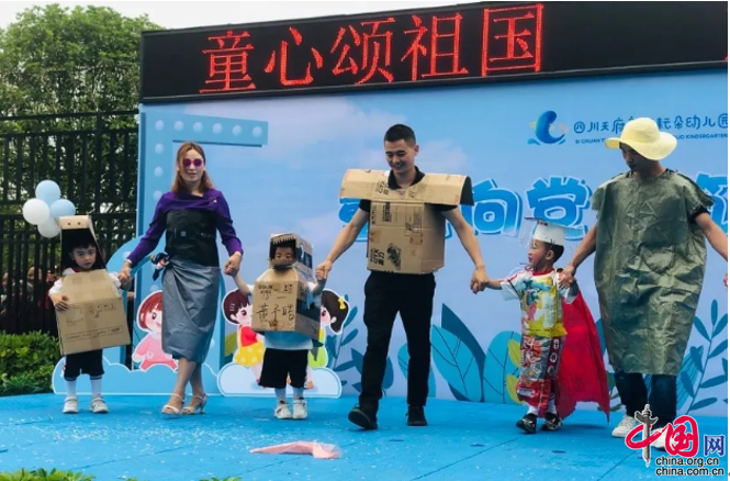 环保时装秀,几个环保袋在爸爸妈妈手上编一编、系上一个蝴蝶结,漂亮的裙子就设计好了!许多废旧物品通过大家的奇思妙想摇身一变,变出满满超能量!