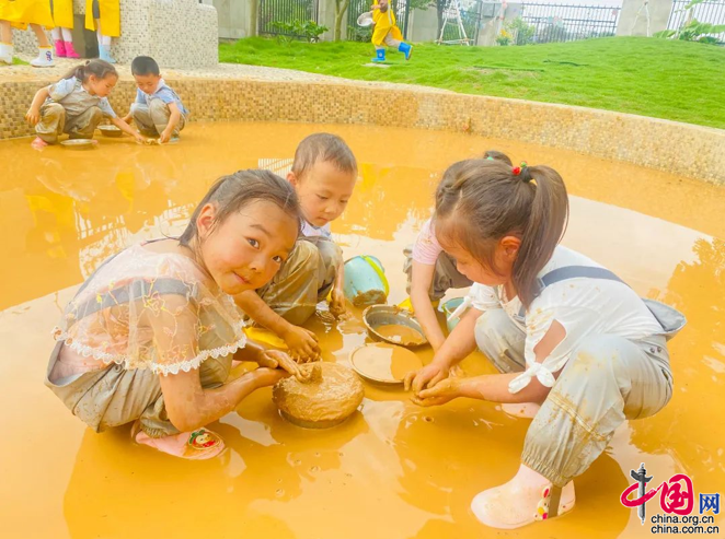 活动中,课题组成员伍琴、钟亚利老师和中一班小朋友走进户外玩泥区现场,孩子们在泥池里如火如荼地开展自主游戏。黑泥种植艾草、黄泥挖沟壑、红泥塑型,踩泥坑……孩子们在老师的带领下探索泥土的不同玩法。