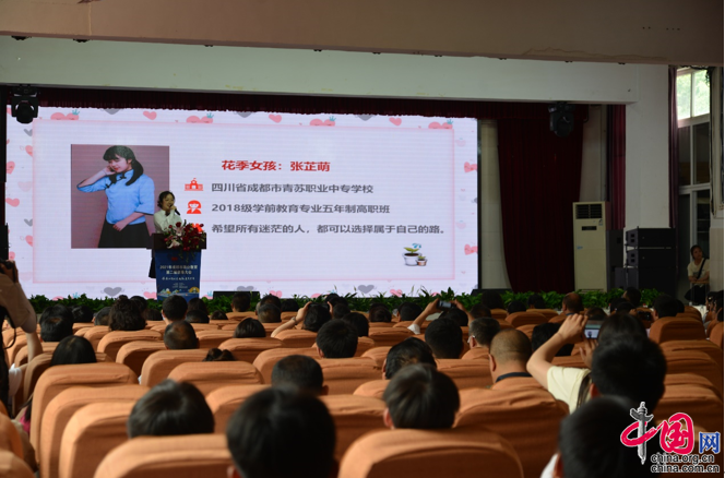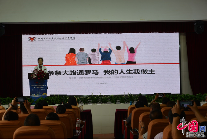 会上,四川省成都市青苏职业中专学校2018级学前教育专业1班学生张芷萌以《条条大路通罗马 我的人生我做主》为题,讲述自己从初中学习、中考后择校、中职学校生活学习和中职升学的成长故事。