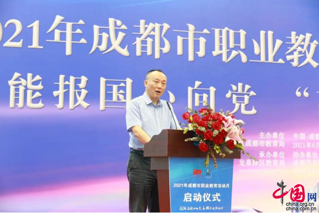 中国网6月16日讯(李小野)为建党100周年献礼,展示全市特色职业教育成果,大力推进成都公园城市示范区职业教育融合创新发展,6月10日,由成都市教育局主办的2021年成都市职业教育活动月启动仪式在四川省成都市龙泉驿区举行。活动以“技能报国心向党、‘高地’引领促融合”为主题,主要举行了2021年成都市职业教育活动月启动仪式和成都市第二届职业教育叙事大会,旨在大力宣传职业教育攻坚以来,成都市职业教育取得的丰硕成果和经验做法,讲好职教故事,进一步营造职业教育发展的良好氛围。四川省成都市青苏职业中专学校学生代表在叙事大会上作主题发言。