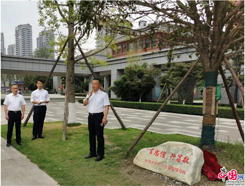 当天,还举行了2018级学子为母校毕业献礼暨“纪念树•纪念石”落成仪式。“十年树木,百年树人。”在中国传统文化里桂花树一直都是吉祥、美好的象征。桂花寓意为“崇高”“美好”“吉祥”,而桂枝寓意为“仕途、出类拔萃”。初2018级学子为母校捐赠桂花树,饱含马鞍折桂,一举夺魁之意。