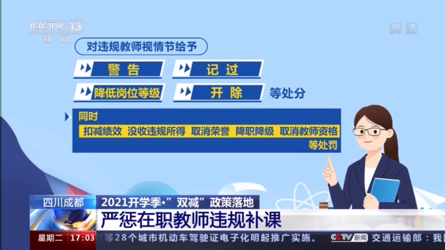 “回头看”行动还将重点打击在职教师违规补课。培训机构如果聘用在职教师违规补课,一经查实,可直接吊销违规培训机构的办学许可证。同时,对违规教师视情节给予警告、记过、降低岗位等级和开除等处分,同时扣减绩效、没收违规所得、取消荣誉、降职降级、取消教师资格等处罚。据介绍,今后成都中小学教师评优选先、职称晋级,须作出“是否参加违规补课”的公开承诺。