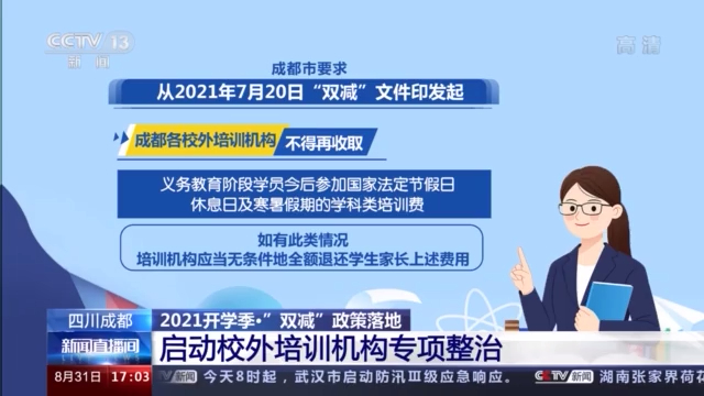成都市要求,从2021年7月20日“双减”文件印发起,成都各校外培训机构不得再收取义务教育阶段学员今后参加国家法定节假日、休息日及寒暑假期的学科类培训费。如有此类情况,培训机构应当无条件地全额退还学生家长上述费用。同时,组织专门力量,成立成都市校外培训机构治理“回头看”工作组。从8月初至12月底,对培训机构进行明察暗访。