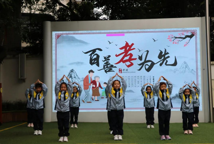 在“传承中华孝道,弘扬重阳文化”主题升旗仪式上,童心班的小朋友进行国旗下的表演《中华孝道》。“百善孝为先,孝敬是根本,天地恩情永难忘,心中扎下根。”小朋友们认真诵读着,并配合着悦耳的歌曲表演着。