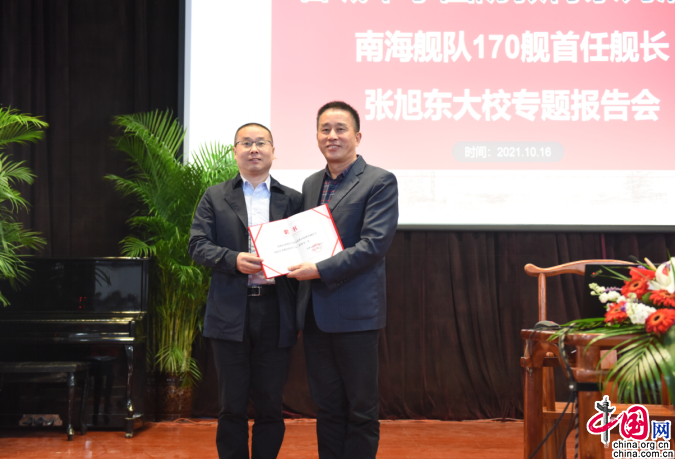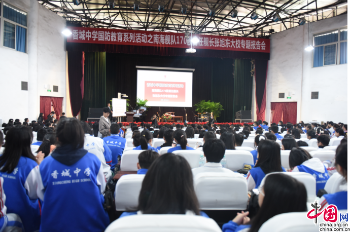 中国网10月18日讯(曾黎)“哇,快看,他好帅啊,好有安全感的那种。”10月16日,成都市新都区香城中学学术报告厅里人声鼎沸,好不热闹。记者走进报告厅,一场由原中国人民解放军海军南海舰队170舰首任舰长张旭东为全校2000余名师生带来的《新时代,新指引,新挑战,新跨越——中国国防安全的挑战和应对》主题宣讲活动正在进行。同时,张旭东接受香城中学校长张世明的聘请,成为成该校国防军事教育指导专家。