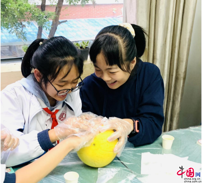 足球那么大的柚子,怎么才能变成柚子茶呢?“每一步都是有学问的。首先,同学们需要把柚子中的果肉剥出来。”在老师的指导下,学子们双手按住柚子,用大姆指插进柚子皮与果肉的空隙中,再用指甲抵住果肉,往外一掀,那柚子皮便挣开了筋脉的“怀抱”,柚子一剥开,一股淡淡的清香马上扑鼻而来。讲台下,合作默契的小组团队,迅速地将所有果肉都剥在了袋子中,为“调制”柚子茶做好了充分准备。