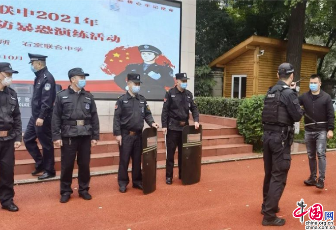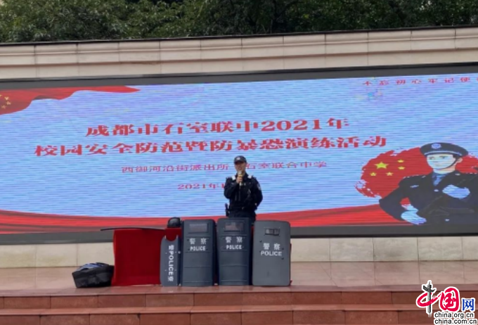 中国网10月29日讯(辜丽茜)为贯彻落实“安全第一,预防为主”方针,有效防范校园暴力事件,近日,成都市石室联合中学开展了一场校园安全防范演练活动。校长宋奕云和青羊区西御河沿街派出所副所长王鑫全程参与并指挥演练活动,青羊区公安分局防暴大队警官全程指导活动演练。