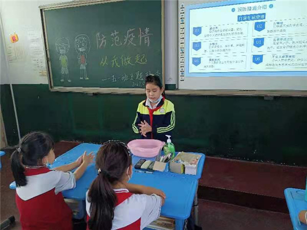 五(1)班从“了解新冠病毒、关注散发疫情、防护措施指南”三个方面开展本次班会,让同学们了解疫情,切勿大意。其中,同学们重点学习了疫情防护的几个方法,如正确佩戴口罩、正确洗手等。几位少先队员还当场为大家做了示范。通过这次班队会,同学们都学会了不少防疫知识。