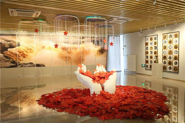 在爱智美育馆一楼《塬间》装饰艺术区,著名秦腔演员陈魁老师一曲“劈山救母”,引来同学们的一片喝彩声。