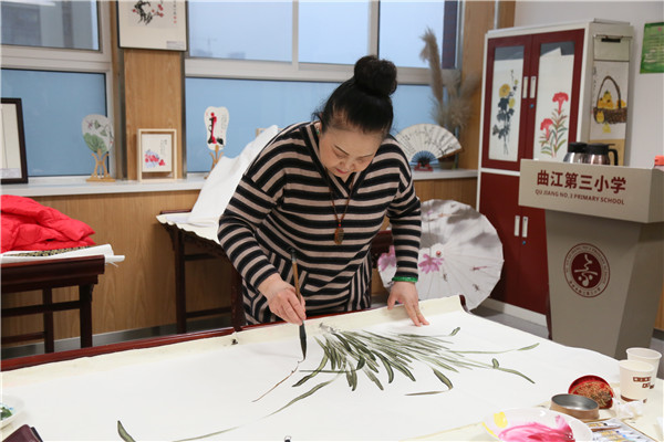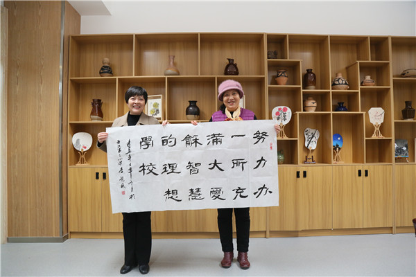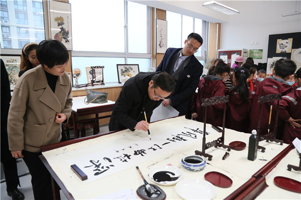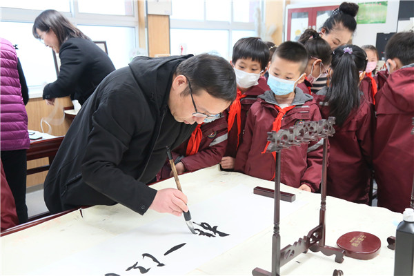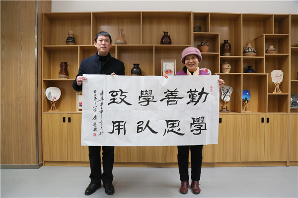 在随后的笔会上,宋亚平、李艳秋、和谷、瞿石明、张念贻等各位专家,为曲江三小挥毫泼墨,花开富贵的牡丹,气韵生动的兰花,“努力办一所充满大爱与智慧的理想校园”、“勤学善思 学以致用”、“循循善诱 因材施教”、“美哉曲江少年”等一幅幅书画作品,引来师生们围观学习,也是对三小的热情期许。