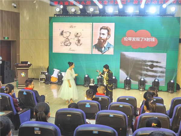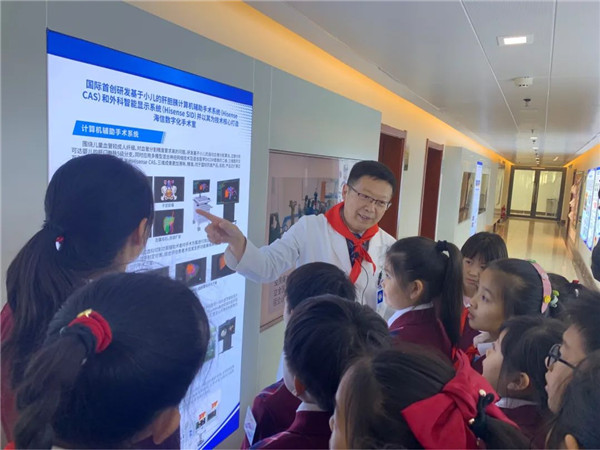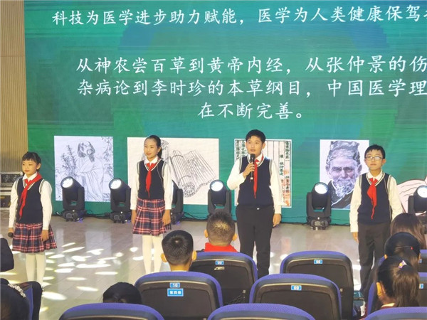 董蒨进行了“播种科学种子、开拓创新未来”的主题讲座,讲述了自己的职业经历、救治病人的故事、依靠科学技术进步推动医学发展的案例,激励学生们积极进取,努力学习科学知识,成长为祖国的栋梁之材。在《科学助力点燃生命之光》研究性学习中,学生们以舞台小剧形式演绎了伦琴发现X射线的故事,介绍了在参观中医药大棚过程中了解到的古今中医药培植技术的发展历程,以数据分析和图表的形式展示了屠呦呦提取青蒿素实验付出的艰苦努力,以视频和演讲的方式与现场所有同学共同回顾了寻访董蒨院长的过程。董院长给同学们介绍的科学技术与医学紧密结合形成的数字医学概念、带领大家观看的世界第一台达芬奇机器人模拟手术视频、指导孩子们体验计算机辅助手术系统引起了在场所有同学的探索兴趣。