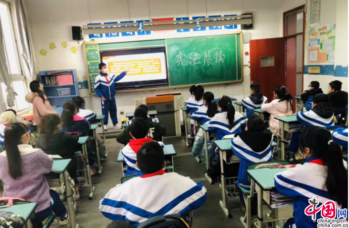 12月3日,全校老师带领全体学生利用晨读时间进行宪法晨读,并观看视频。通过晨读《宪法》序言及相关章节内容的解读,向全体学生普及宪法知识,使师生们了解国徽、国歌及宪法的由来和代表的含义。