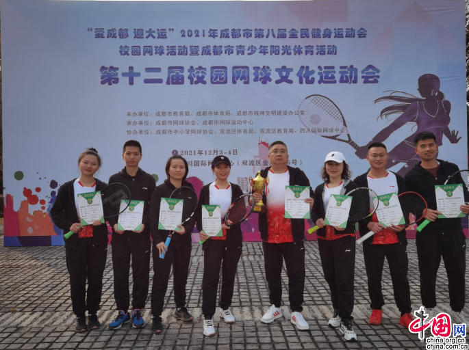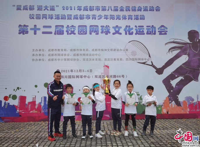 中国网12月10日讯(辜丽茜)近日,成都市青羊实验中学附属小学网球队由校长张胜带队,参加了“爱成都 迎大运”2021年成都市第八届全民健身运动会校园网球活动暨成都市第十二届校园网球文化运动会,并获得教职工团体季军的殊荣。