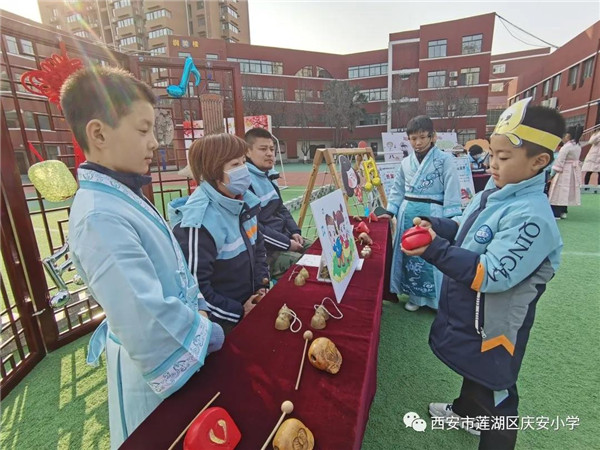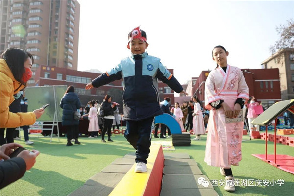 “跨越护城河”锻炼学生肢体协调能力;“我是小向导”、“我会背诗歌”,认读词语,背诵诗词,于游戏中考查语文知识点;“长安小百灵”与“长安小乐师”,在快乐中的歌声与打击乐声中完成音乐考查;“快乐设计师”与“魔术变变变”,发挥学生的设计创意,唤醒学生的色彩灵感;“我是小掌柜”、“西市小当家” 不仅考查了学生们对题意的理解和计算能力,也考查了他们的口头语言表达能力,“我爱上学堂”、“奔跑小勇士”、“唐风秦韵”……孩子们在一道道欢乐的关卡中,完成了各学科的考查。