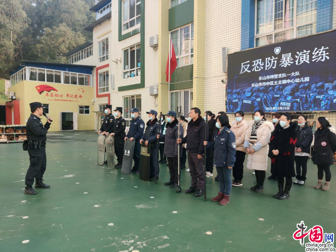 中国网12月22日讯 为提高全体师幼安全意识,加强师幼在遇到歹徒行凶等突发性恐怖事件时的应变能力,以及面对恐怖事件的合理处理、自护自救及保护幼儿有效逃生避险的能力。12月21日,乐山市市中区土主镇中心幼儿园教育集团联合乐山市公安局巡特警支队一大队进行了反恐防暴演练活动。