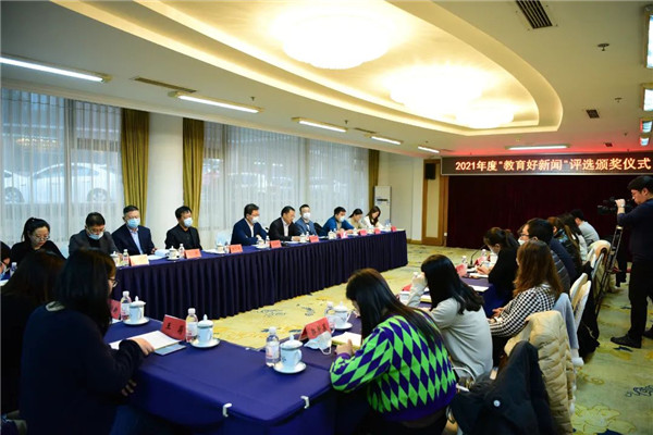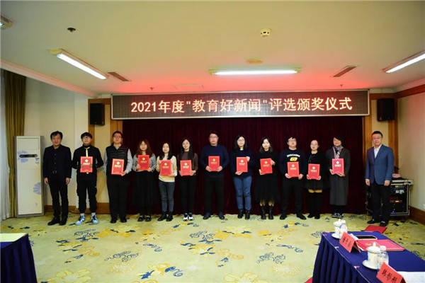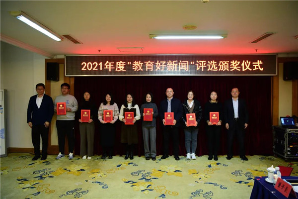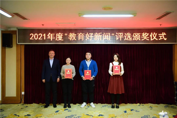 2021年度“教育好新闻”评选活动共评出好新闻作品34件。孙立杰、刘鹏照;赵慎安、颜涛;秦新分别为2021年“教育好新闻”一等奖、二等奖和三等奖获奖记者颁发荣誉证书。