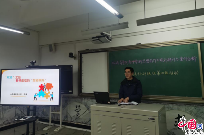 中国网12月24日讯(董容榕)为增强各校教科室主任对“双减”背景下学科作业设计的理性认识和直观操作感知,促进教科室主任的理解和认同,从而提升联组教科室主任组织和指导学校教师开展科研的能力。12月23,成都市大邑县科研联组第四组在鹤鸣小学开展主题为“‘双减’背景下,基于学科思想的作业设计与案例分析”的研讨活动。活动由北街小学教科室主任罗勇主持。参加此次活动的有大邑县教育局科研室主任邓子祥、北小安全办主任陈春、科研联组第四组全体教科室主任和科研骨干教师。