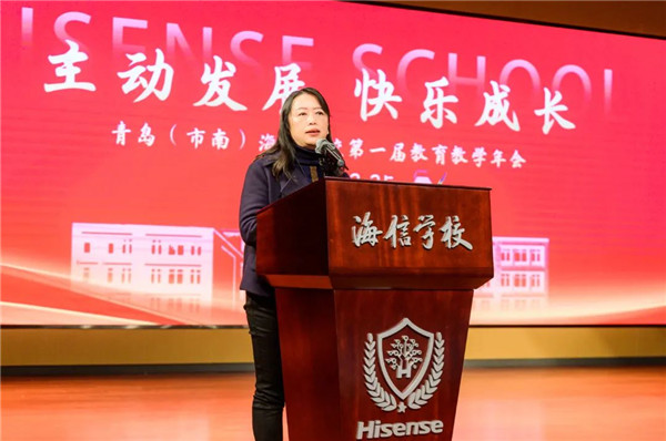 海信学校副校长王永祥主持会议,海信学校总督学马林做《铺设主动发展道路,点亮快乐成长未来》主题致辞。