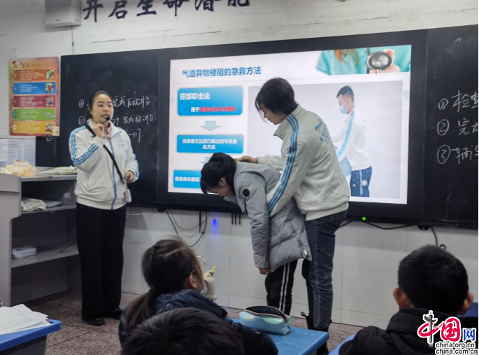 中国网12月29日讯 近日,乐山市人民医院“生命航班”团队走进乐山市实验小学六(6)班,为同学们讲解、演示被异物卡住气道后应采取的急救措施及心肺复苏方法,给同学们上了一节生动的生命教育课。