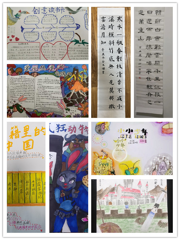 六年级的同学们的课外阅读和生活积累都是最丰富的,他们根据自己的阅读经验和生活体验,或“创意读书卡”,或“创意海报”,或“创意书法”作品,表达对生活和传统文化的无比热爱。