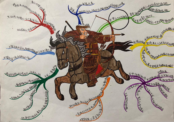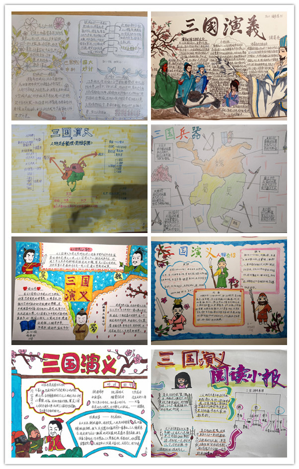 五年级的同学们寒假共读了《三国演义》这本书,孩子们用多样的表现形式表达了不同的阅读感受:有的罗列人物关系,有的讲述书中故事,有的绘制“兵器谱”,还有的介绍“四大妙计” ……