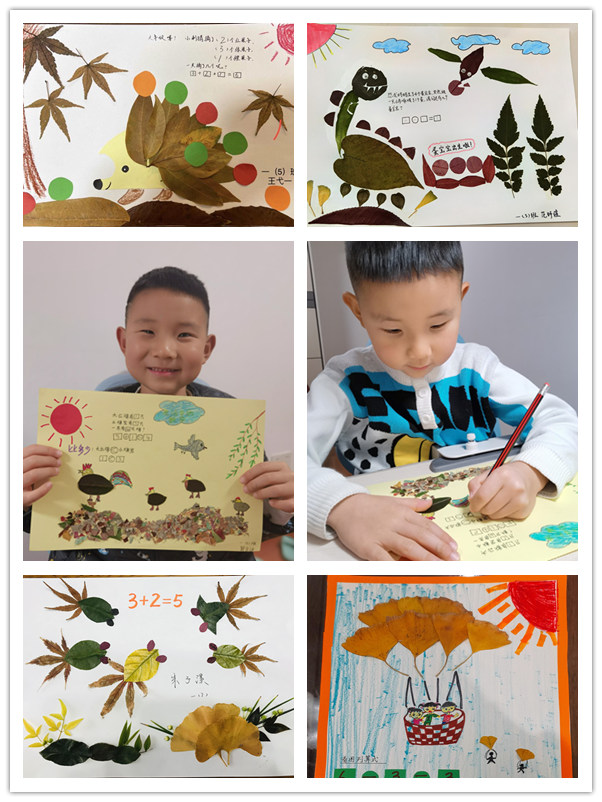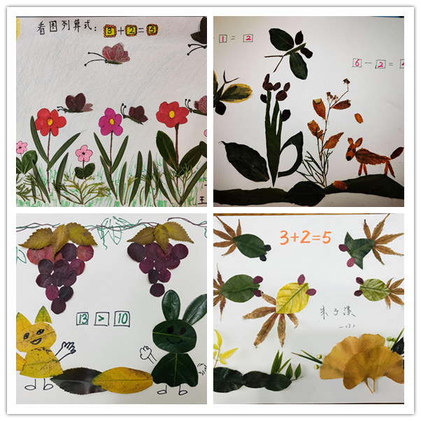 一年级小朋友把创意画与数学进行了完美的结合,在大自然中发现数学课上所学习到的“比一比”、“分与合”、“加减法”等数学知识。