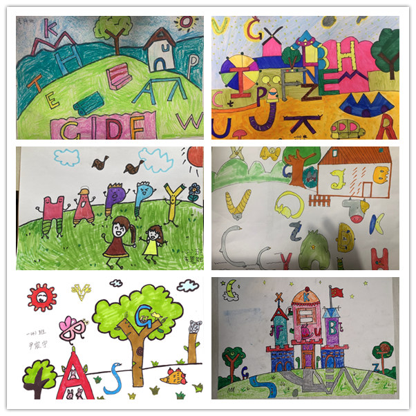一年级的小朋友用奇思妙想,惟妙惟肖地将英文字母与绘画结合,赋予简单的字母丰富的涵义,构成了一幅幅完整又充满童趣的创意画。