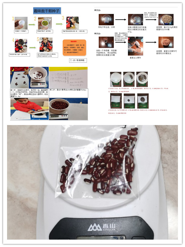 二年级小朋友进行了“数千颗种子”的活动,先进行思考:怎样用数学的方法快速数出一千颗种子,然后把数的方法简要记录下来并付诸实践。