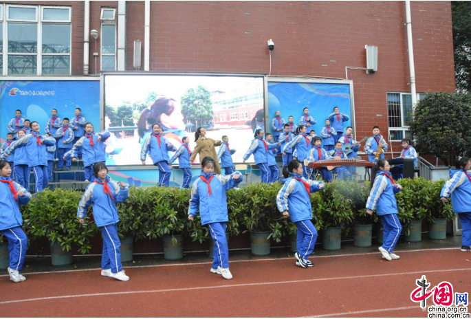 “花重锦官”“蜀汉都城”,杜甫笔下如诗如画的成都、三国时期叱咤风云的成都、现代发展充满活力的成都……都在草西师生共同演绎的大运会主题推广歌曲《群英荟》中栩栩展开。一曲未尽,一舞又起,草西舞蹈队的孩子们用舞蹈动作,模仿出田径、艺术体操、射箭、篮球等大运会运动项目,随之引来一场全校互动、欢乐纷呈的大运运动秀。站在新学期的开端,校长付锦鼓励同学们与体育为友,在运动中塑造体魄、磨砺意志;当好大运小小东道主,用饱满的精神面貌和实际行动,向世界展示成都的魅力与风采。
