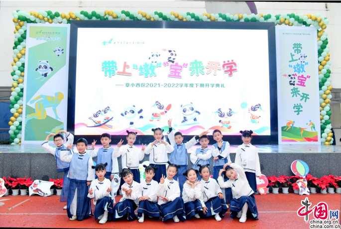 开学第一天,草堂小学西区分校的孩子们将自制的“冰墩墩”“雪容融”“蓉宝”元素的物件儿,或挂、或贴、或戴在身上,大家你瞅瞅我的,我欣赏欣赏你的,乐在其中。整个开学典礼上,充满着足足的冬奥味儿、浓浓的大运风!