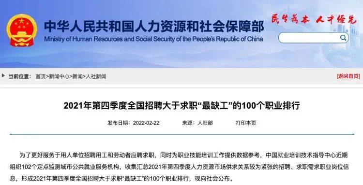 人社部官网22日发布2021年第四季度全国招聘大于求职“最缺工”的100个职业排行, 营销员、餐厅服务员、商品营业员、车工、家政服务员、保安员、包装工、客户服务管理员、保洁员、快递员等职业位列排行前十。