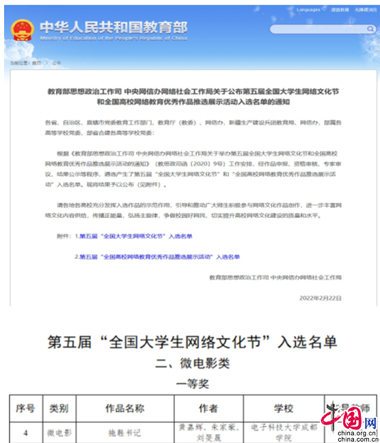 中国网2月25日讯(辜丽茜)近日,由教育部思政司、中央网信办网络社会工作局主办的第五届“全国大学生网络文化节”和“全国高校网络教育优秀作品推选展示活动”入选名单公布,电子科大成都学院微电影《拖鞋书记》获全国一等奖,微课《从战“疫”中读懂党的初心和使命》获全国优秀奖。