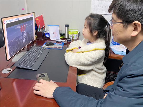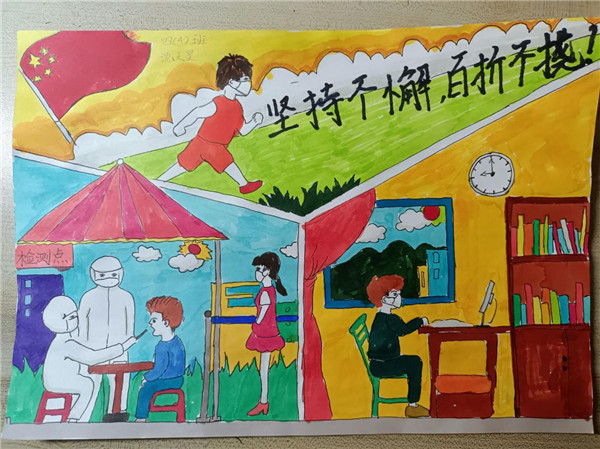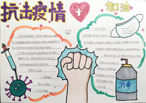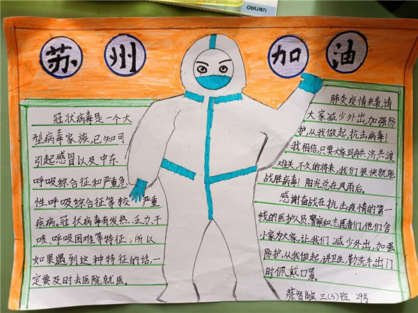 线上班会课上,同学们一起观看视频《致敬“姑勇者”》。有的同学主动分享了自己的爸爸妈妈作为医护人员前往一线支援的事迹,有的同学展示了自己亲手绘制的抗疫手抄报,用绘画的形式向奋斗在一线的抗疫人员加油助威。
