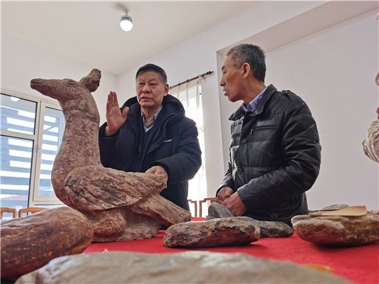 傅仁义(左)正在判断一件凤鸟藏品的年代
