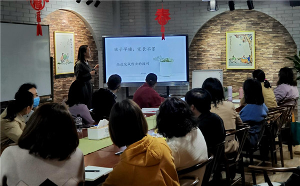 冯女士是第一期陪育师课程的学员,她在课程中和王女士成为了闺蜜,姐妹俩共同创建了“赋伴读书会”科技城站。大大小小的读书会在科小家长间有很多,“赋伴读书会”只是其中之一。她们和其他陪育师学员还自发组织成立了“科小陪育师讲师团”,自由组成几个备课小组,为家长们开设散点菜单式的课程。比如一位六年级家长的“如何指导孩子高效完成作业”系列讲座,深受家长们欢迎。除此之外,第一期陪育师课程的12位优秀学员还组织了爸爸妈妈聊天吧,分享他们在陪育师课程的所得。