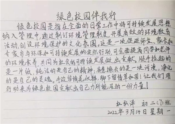 优美的环境,让我们懂得珍惜,学会爱护;优美的环境,让我们学习进步,道德高尚;优美的环境,让我们学会谦让,学会做人。在此,呼吁大家,创建绿色学校,人人有责!
