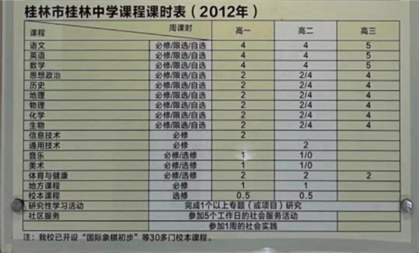在全面深化课程改革时期,教育部提出研究制订学生发展核心素养体系和学业质量标准。至此,核心素养成为了课程改革的重要理念,而“基于核心素养”成为了教育界的热词。桂林市桂林中学“依据学生发展核心素养体系”不断完善课程教学有关标准,新的课表孕育而生。