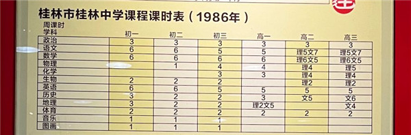从1978年改革开放至今,40多年来,中国发生了翻天覆地的变化。中国改革开放的历史发展逻辑和规律不可避免地会反映和投射到课程改革的历史进程中来,然而随之转变的还有桂林市桂林中学的课表。现代课表的模样已基本成型。1977年恢复高考,文理分科逐渐形成。
