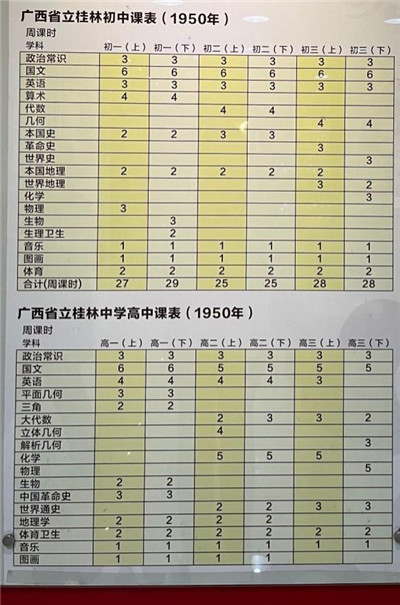 1921年中国共产党成立,在28年间(1921-1949年)先后带领人民参加了北伐战争、抗日战争、解放战争,并最终都取得胜利。中国共产党的诞生是中国历史上开天辟地的大事,使中国的革命面貌焕然一新。广西省立桂林中学在原课表的基础上,将中国革命史编入高中课程,每周共3节,使学生们充分了解党的光辉历史,坚持党的领导方针,更好的为党效力。同时将劳动课修改成了体育卫生,每周共2节,开始有了基本的体育项目,使同学们更好地锻炼身体。同时将几何计算也融入高中课程,增强了学生们的空间感,在思考问题时,也能从多角度立体地看问题。