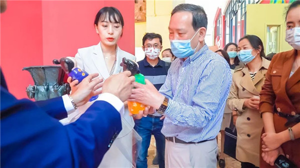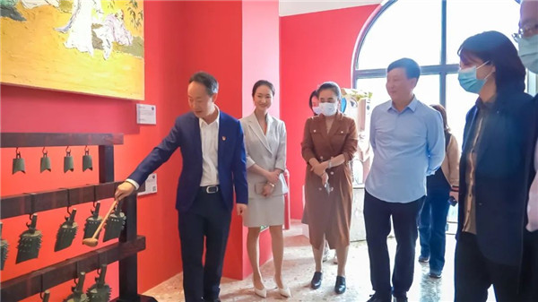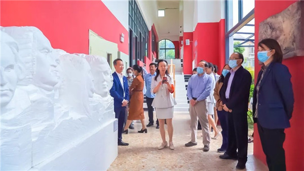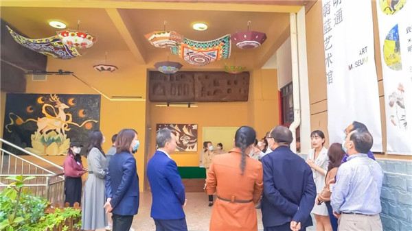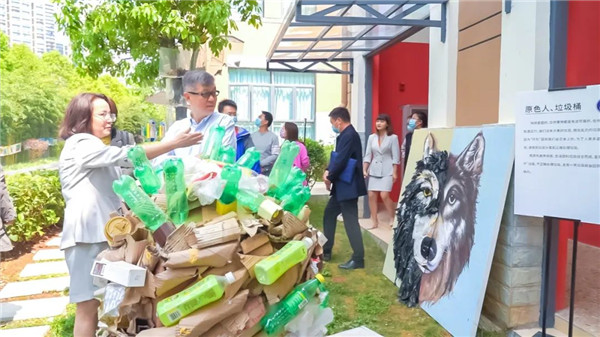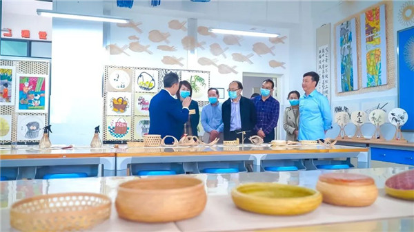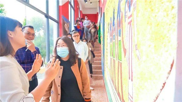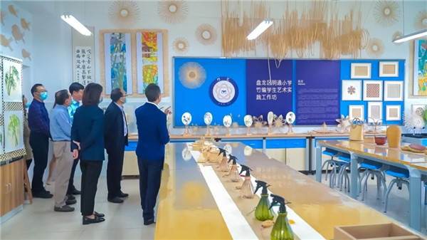 明通小学校歌余味尚存,文化艺术即将拉开序幕。以刘毅校长为代表的明通小学生态文明教育校本课程开发课题组邀请领导、专家和老师代表们来到阶梯教师外围具有明通小学生特色的美育研学基地展览区,参观师生共建的生态文化艺术长廊,体验生态文明教育和美育课程实施成效。