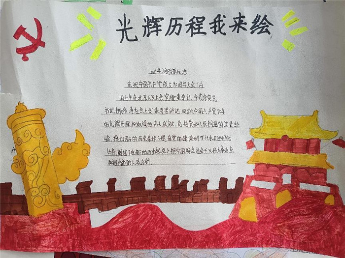 在手抄报制作过程中,六年级同学积极参与,绘制了一幅幅图文并茂、赏心悦目的精美手抄报。一图一画、一字一句,淋漓尽致地展现出了同学们爱国爱党的情怀。那匠心独具、情深意浓的作品受到了同学、老师的啧啧称赞。
