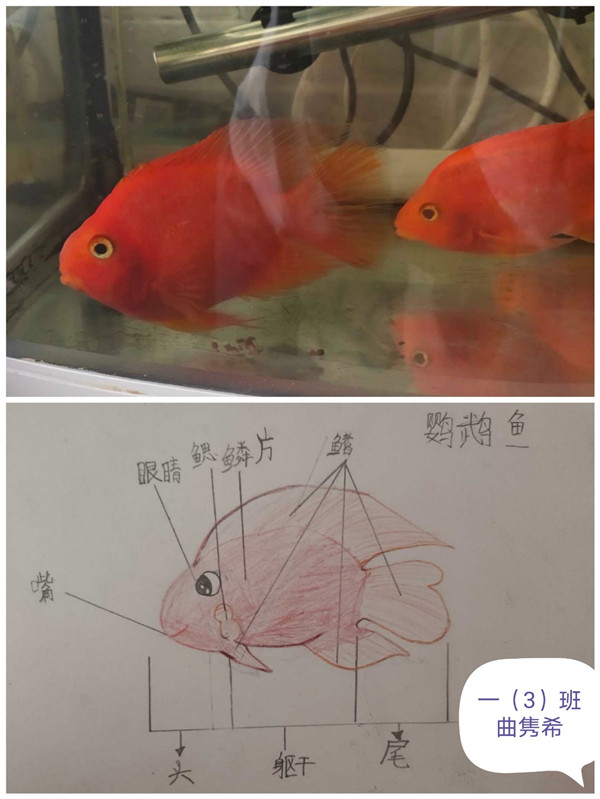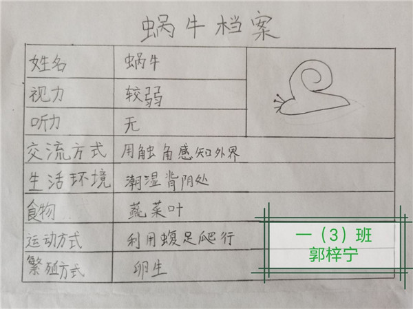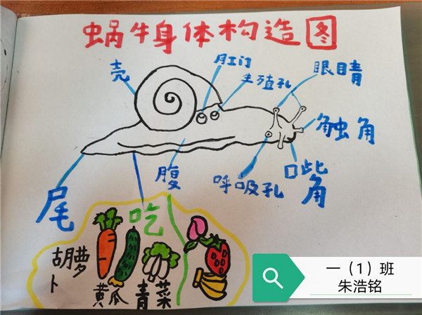低年级的小朋友与小动物为伴,认真观察蜗牛、金鱼等小动物,还学习到了用科学的词汇来描述这些小动物的身体结构,通过绘画、标注等方法记录了它们的特征,慢慢具备了小小科学家的基本素养。