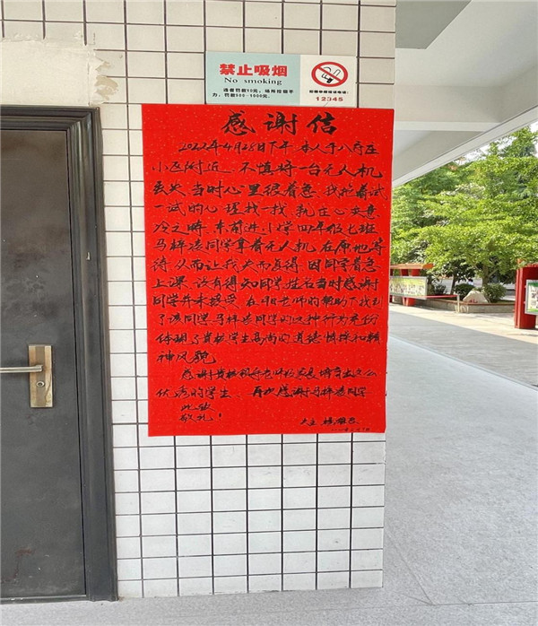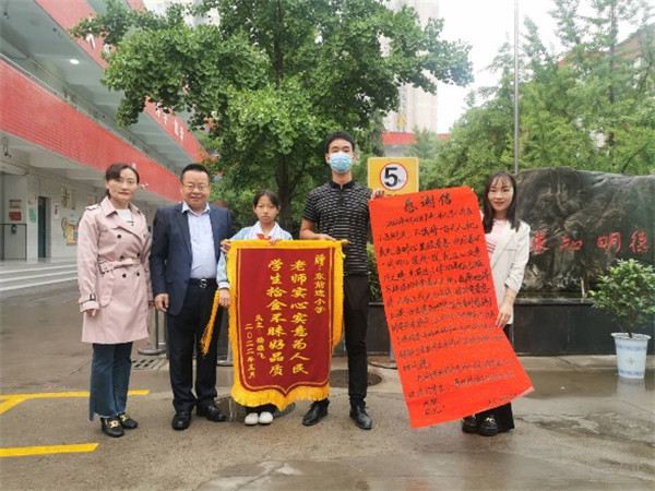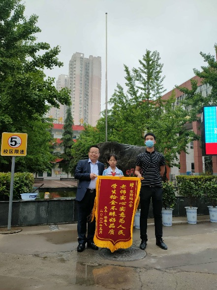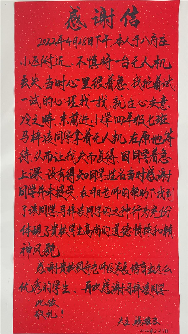 2022年4月28日下午东前进小学四年级七班马梓凌同学在上学路上捡拾到一架无人机,并在原地等待失主到来。当失主得知学生耽搁上课时间一直原地等待,失主大为感动。5月9日上午失主杨先生为拾金不昧的同学送来“学生拾金不昧高品质,老师实心实意为人民”的锦旗。