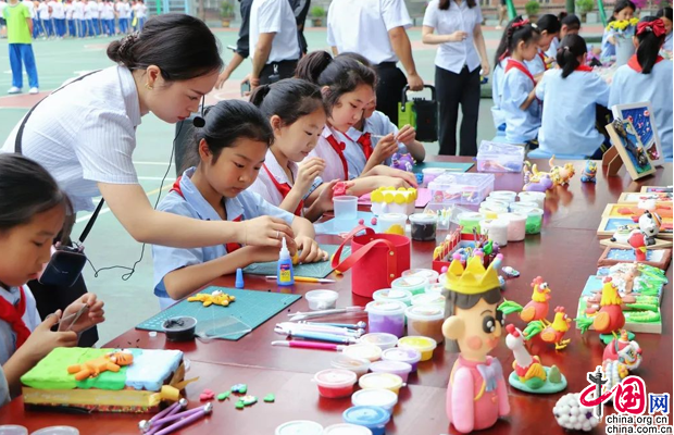 古筝社团从容拨弹,古朴音韵指尖流转;水墨社团信手勾勒,奇趣画面跃然纸上;书法社团笔走龙蛇,起行转收一气呵成;葫芦丝社团和口风琴社团柔声吹奏,悠扬婉转,泛起阵阵涟漪;鼓号队表演铿锵有力,气势磅礴,激起千层巨浪;手工社团利用扭扭棒、超轻黏土、彩纸进行现场创作,作品惟妙惟肖,妙趣横生;武术社团动作行云流水,合唱社团歌声悦耳动听,再加上学生形式多样的读书笔记,青年教师的粉笔字和每周教育随笔,精彩纷呈的展示让大家目不暇接,赞不绝口。