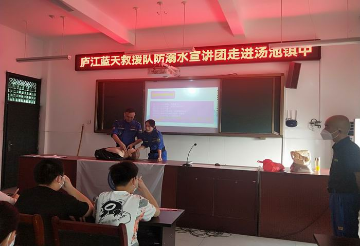 5月27日上午,庐江县蓝天救援队防溺水宣讲团走进庐江县汤池镇初级中学,开展防溺水安全教育宣讲活动。