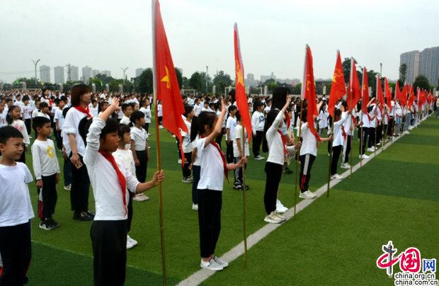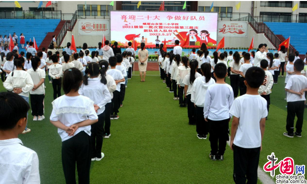 中国网5月30日讯 5月27日,峨眉山市第二小学一年级第一批、二年级第三批共503名学生怀着激动的心情集中在运动场,参加了一场庄严、隆重的新队员入队仪式。