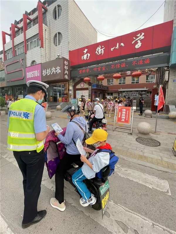 结合当前开展的临汾市“一盔一带”专项整治行动,交通民警在学校上下学家长接送孩子期间,开展《临汾市电动自行车管理条例》集中宣传教育活动,把“一盔一带、安全常在”的理念宣传到每个儿童家长心中,督促提醒家长天热骑行电动自行车要主动佩戴安全头盔,通过对家长的引导和教育,让家长为儿童做出表率,实现大手牵小手、交通安全记在心中的良好习惯。