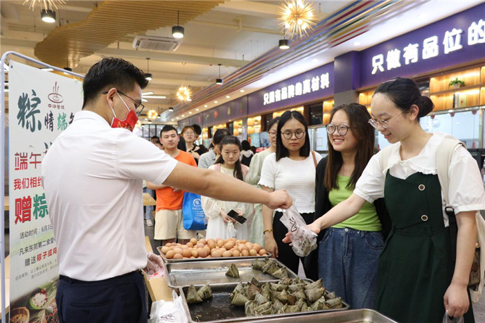 除了开展包粽子体验活动外,两校区6个食堂进行一场“梦幻联动”,纷纷推出端午免费福利活动,抽餐券,领奖品,短短一上午共发放了12000个粽子给学生。早上不到7点,数学与应用数学专业2018(3)班的陈朦瑶便赶到了东苑第二食堂,领取到端午当天的第一个粽子,并玩起“磕鸡蛋”小游戏领双份礼物。