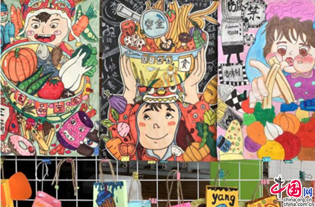 在校园悦读区展览的美术作品中,有一、二年级绘画社团同学彩绘的成都美食,有五年级学生的随堂作品——新颖别致的提袋设计,还有六年级毕业班每个学生的自画像……孩子们用画笔描绘着幸福,用剪刀裁剪着美好,在百余件美术作品中,积极向上的内容,明快鲜艳的色彩,把孩子们的童真童趣展现得淋漓尽致。